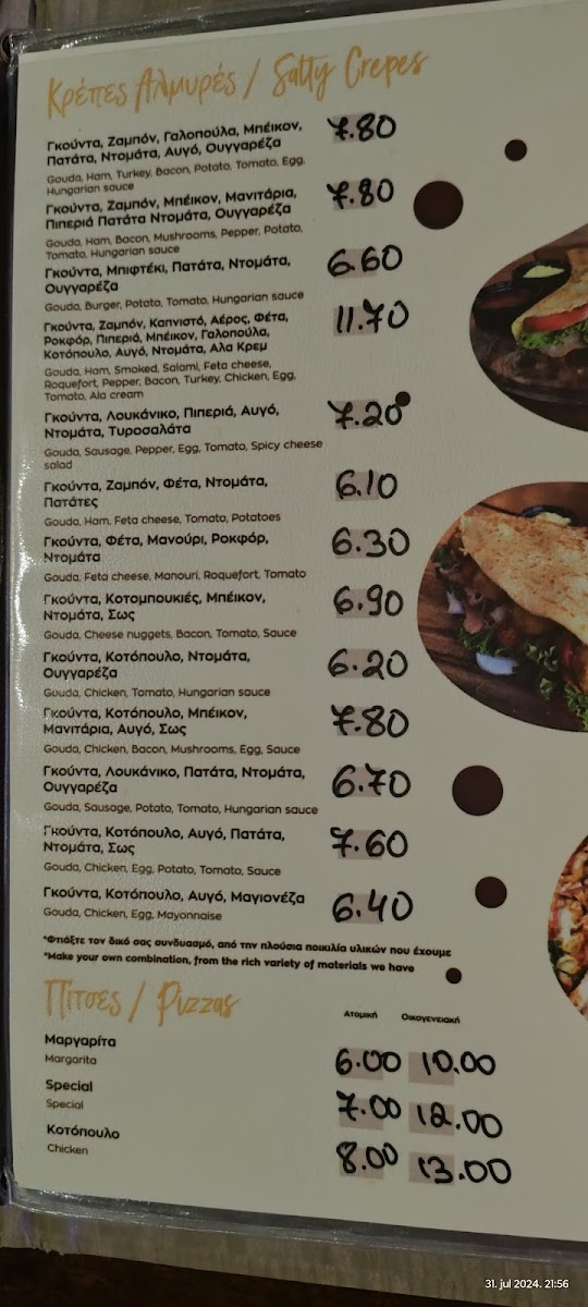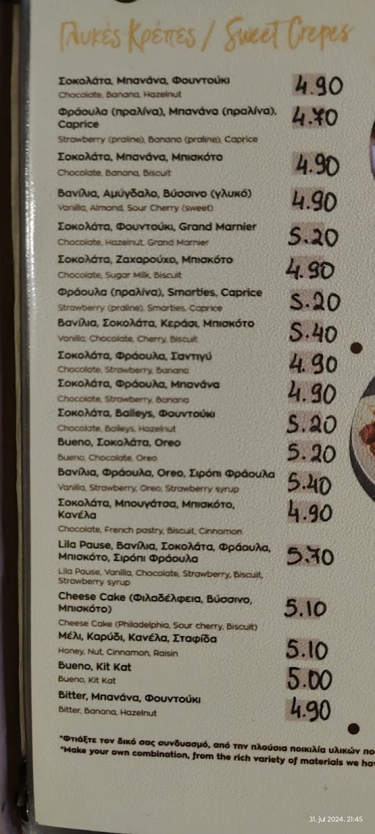 Δημιουργήστε τη δική σας γλυκιά κρέπα με τα αγαπημένα σας υλικά. Η τελική τιμή θα καθοριστεί βάσει των επιλογών σας